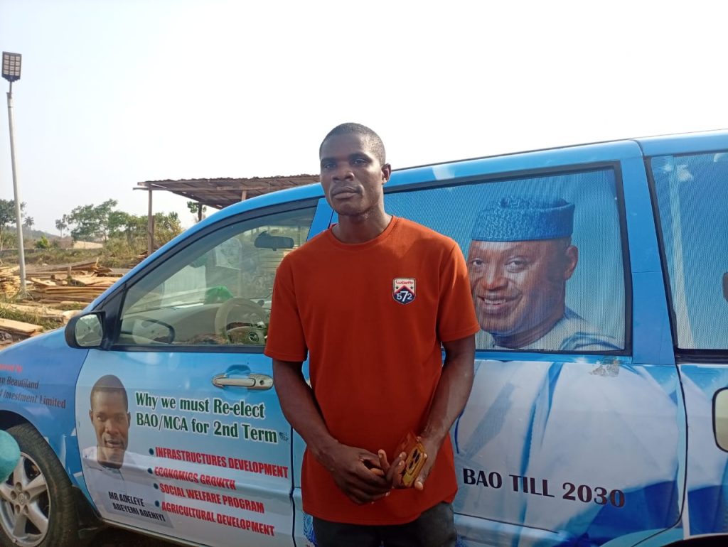 A mini truck driver who convey planks from BAO Timber Market, Adewusi, Ado Ekiti and indigene of Ado-Ekiti, Mr. Adeniyi Adeyemi Adeleye has obtained online loan  with monthly interest to buy and branded a space bus in support of Governor Biodun Abayomi Oyebanji second term ambition, citing the governor’s developmental achievements across Ekiti State .